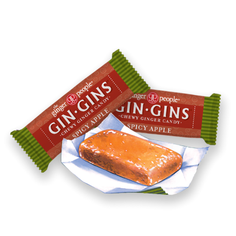 INGREDIENTE: zahăr din trestie, sirop de glucoză, ghimbir (10%), amidon de tapioca, aromă naturală de mere, aromă de ulei de scorțișoară, făină de orez, lecitină de soia, sare, acid citric. Poate conține urme soia și alune.